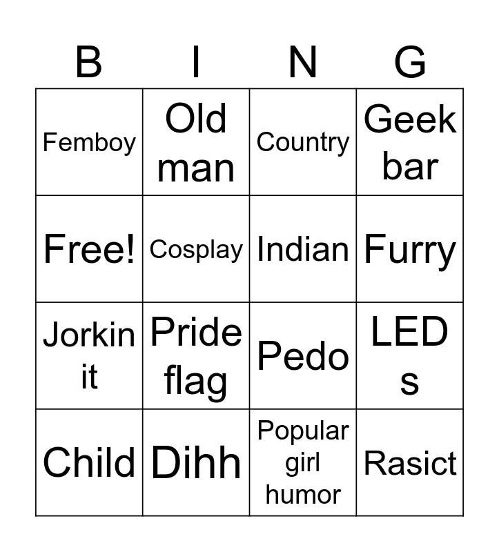 This bingo card has 16 words: Dihh, LED s, Country, Femboy, Jorkin it, Old man, Pedo, Popular girl humor, Free!, Cosplay, Child, Geek bar, Pride flag, Furry, Indian and Rasict.
