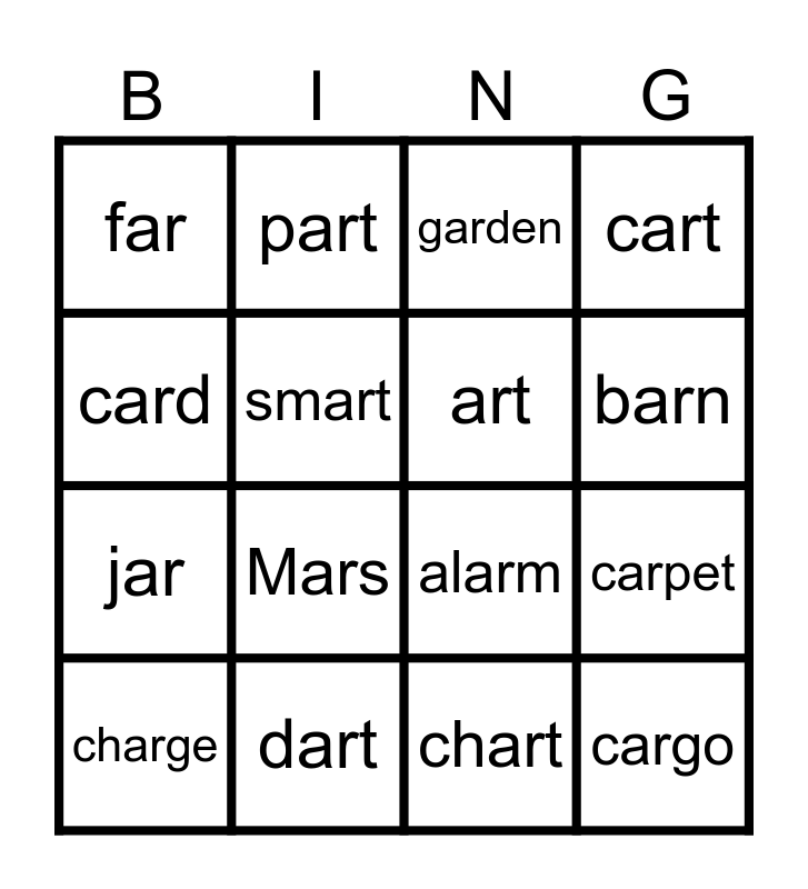 This bingo card has 41 words: Free!, alarm, arm, art, artist, bark, barn, car, card, cargo, carpet, cart, charge, chart, dart, far, farm, far, garbage, garden, garlic, guitar, harp, jar, large, marble, mark, marker, Mars, mart, park, part, party, scar, shark, smart, star, target, tart, yard and yarn.