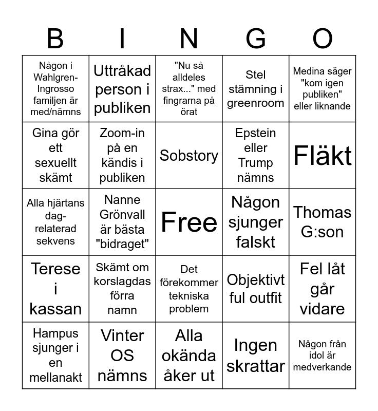 This bingo card has a free space and 24 words: Skämt om korslagdas förra namn, Vinter OS nämns, Sobstory, Hampus sjunger i en mellanakt, Medina säger "kom igen publiken" eller liknande, Någon i Wahlgren-Ingrosso familjen är med/nämns, Gina gör ett sexuellt skämt, Uttråkad person i publiken, Någon sjunger falskt, Det förekommer tekniska problem, Epstein eller Trump nämns, Alla hjärtans dag-relaterad sekvens, Objektivt ful outfit, Fel låt går vidare, Zoom-in på en kändis i publiken, Ingen skrattar, Thomas G:son, "Nu så alldeles strax..." med fingrarna på örat, Fläkt, Nanne Grönvall är bästa "bidraget", Någon från idol är medverkande, Terese i kassan, Stel stämning i greenroom and Alla okända åker ut.