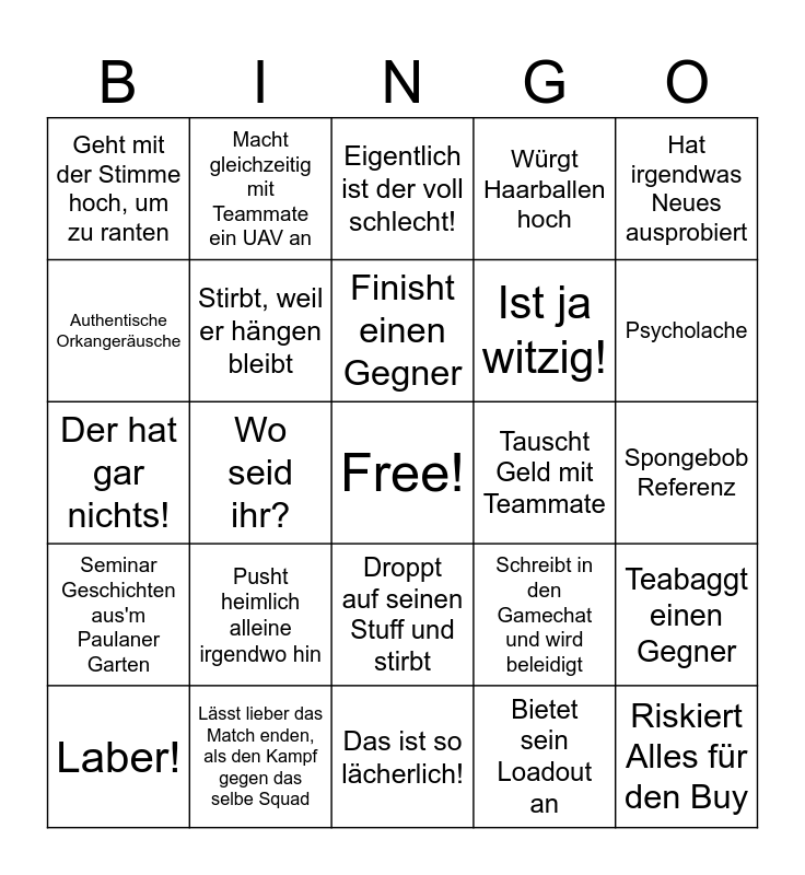 This bingo card has a free space and 24 words: Pusht heimlich alleine irgendwo hin, Lässt lieber das Match enden, als den Kampf gegen das selbe Squad, Finisht einen Gegner, Laber!, Hat irgendwas Neues ausprobiert, Geht mit der Stimme hoch, um zu ranten, Authentische Orkangeräusche, Macht gleichzeitig mit Teammate ein UAV an, Tauscht Geld mit Teammate, Droppt auf seinen Stuff und stirbt, Ist ja witzig!, Der hat gar nichts!, Schreibt in den Gamechat und wird beleidigt, Teabaggt einen Gegner, Stirbt, weil er hängen bleibt, Bietet sein Loadout an, Spongebob Referenz, Eigentlich ist der voll schlecht!, Psycholache, Wo seid ihr?, Riskiert Alles für den Buy, Seminar Geschichten aus'm Paulaner Garten, Würgt Haarballen hoch and Das ist so lächerlich!.