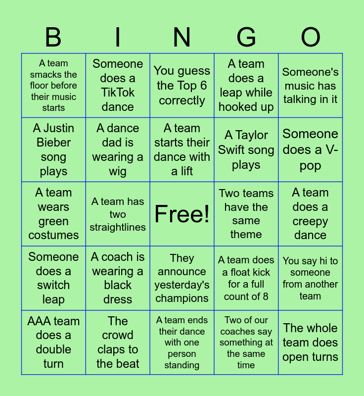 This bingo card has a free space and 39 words: A Dua Lipa song plays, A team performs in pants, A team has face paint on, A dance dad is wearing a wig, AAA team does a double turn, They announce yesterday's champions, A team starts their dance with a lift, The "wave" starts, Someone's music has talking in it, Someone does a switch leap, A team has two straightlines, A team does a leap while hooked up, The whole team does open turns, A team does a creepy dance, Two teams have the same theme, A coach is wearing a black dress, A team performs in a red costume, A team smacks the floor before their music starts, Someone in Class A does a double jump, A team does a float kick for a full count of 8, A Justin Bieber song plays, A team ends their dance with one person standing, A Taylor Swift song plays, Someone does a V-pop, There's a rank point total of 5, Someone performs to a Lady Gaga, Rihanna, or MJ song, A team in AA does an inverse fan, A fan is wearing a suit, Someone's phone has 5% battery, Someone does a TikTok dance, A state coach is wearing jeans, You take a photo and add it to the banquet folder, You guess the Top 6 correctly, The crowd claps to the beat, Two of our coaches say something at the same time, Someone on our team says "yay", You say hi to someone from another team, A team wears green costumes and Someone asks "which team is this?".