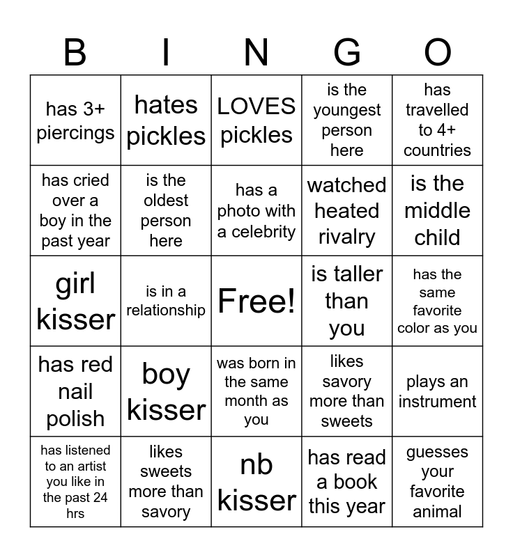 This bingo card has a free space and 28 words: has red nail polish, was born in the same month as you, is taller than you, guesses your favorite animal, has 3+ piercings, hates pickles, has a photo with a celebrity, likes savory more than sweets, has the same favorite color as you, has listened to an artist you like in the past 24 hrs, is in a relationship, is the youngest person here, plays an instrument, has played the same sport as you, is the oldest person here, is wearing pink, has read a book this year, has travelled to 4+ countries, has cried over a boy in the past year, likes sweets more than savory, LOVES pickles, is good as something you’ve always wanted to learn, is the middle child, girl kisser, boy kisser, nb kisser, watched heated rivalry and slept in this morning.