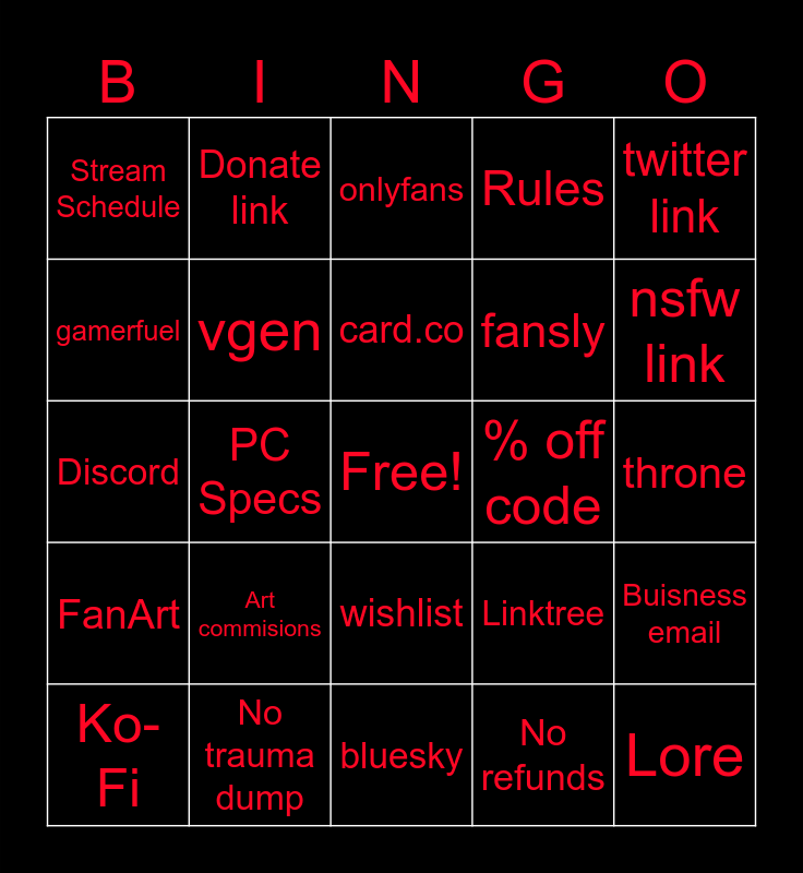 This bingo card has a free space and 24 words: Art commisions, No trauma dump, card.co, Ko-Fi, twitter link, Stream Schedule, gamerfuel, Donate link, % off code, wishlist, fansly, Discord, Linktree, Buisness email, vgen, No refunds, throne, onlyfans, nsfw link, PC Specs, Lore, FanArt, Rules and bluesky.