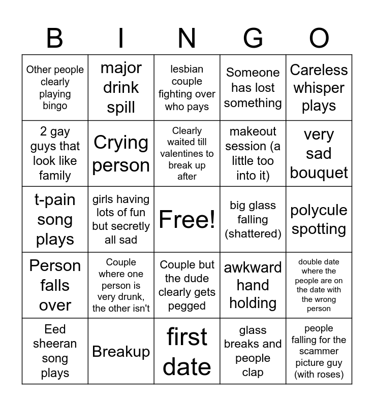 This bingo card has a free space and 24 words: Couple where one person is very drunk, the other isn't, Breakup, Clearly waited till valentines to break up after, Eed sheeran song plays, Careless whisper plays, Other people clearly playing bingo, 2 gay guys that look like family, major drink spill, big glass falling (shattered), Couple but the dude clearly gets pegged, makeout session (a little too into it), t-pain song plays, awkward hand holding, double date where the people are on the date with the wrong person, Crying person, glass breaks and people clap, polycule spotting, lesbian couple fighting over who pays, very sad bouquet, girls having lots of fun but secretly all sad, people falling for the scammer picture guy (with roses), Person falls over, Someone has lost something and first date.
