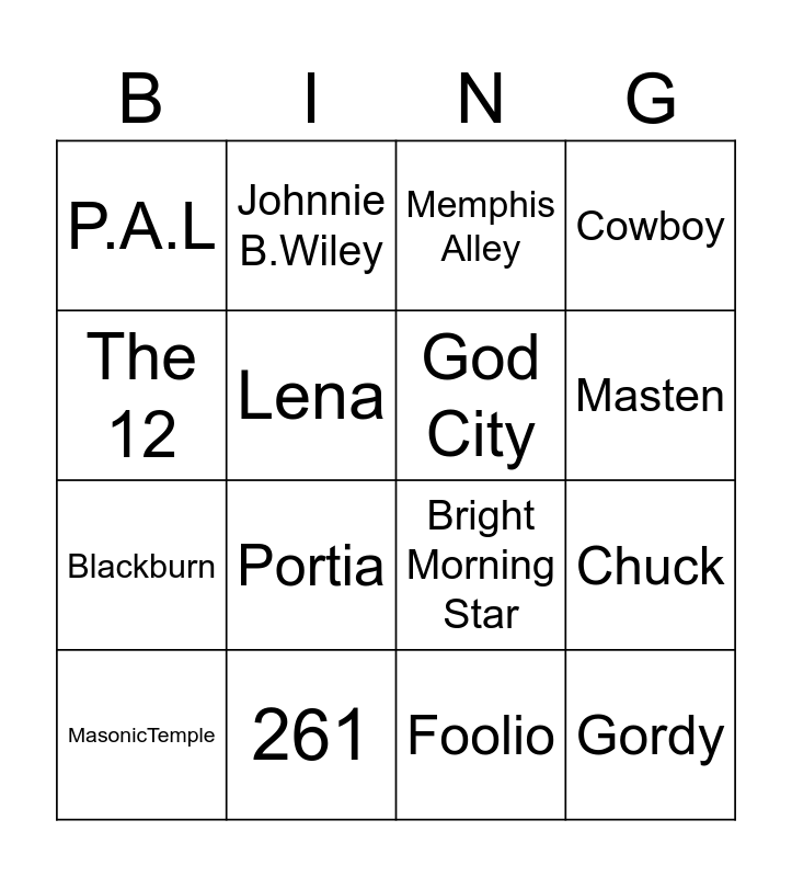This bingo card has 59 words: Free!, leon, claudette, Gordy, GGs, Star Market, God City, Bethesda, Blackburn, Brad, Cowboy, Happy, Lena, Family Dollar, School 8, P.A.L, MasonicTemple, The 12, Utica Station, Masten, 261, Memphis Alley, laurel, Riley, Jefferson Ave, Frank E. Merriwether aka North, Chevy, Lorna, Portia, Jason James, Jim Bell Cleaners, Doris Records, African American Cultural Center, City Honors, Johnnie B.Wiley, Makowski, Southampton, Chuck, Purdy, Bright Morning Star, Greater hope, Mike Perry, Foolio, Mike's lounge, The Croskerys, Dexter Pharmacy, Rosemary, Jerome, Verplank, Kiana, Jalila, Aqouria, Mont Mont, The Bells Family, The Lane Family, The Stallworth Family, Landon, Buffalo Traditional and 716-882-7619.
