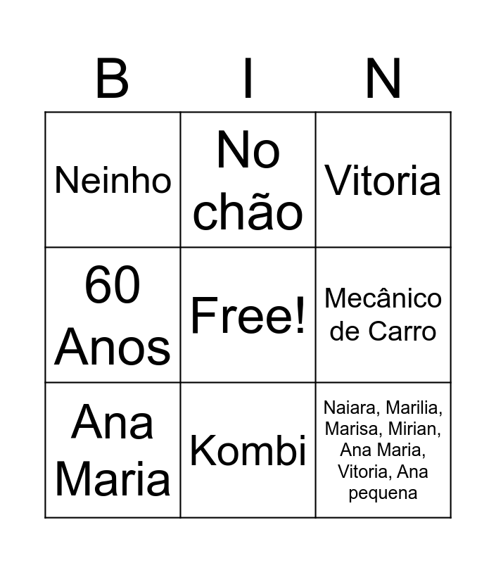 This bingo card has a free space and 31 words: Felipe, Ana Pequena, Helena Cristina e Nicolau, 5 netos, Neinho, Vitoria, Ana Maria, Delza, 7 anos, Guilhermina e José, Samuel Felipe, caia da ladeira, Abacaxi e Melão, Amarelo, Carro Velho, Amarelo e Azul, Schin Carioca, Amarela, 1966, Felipe, Mario, Rafael, Pedro, Naiara, Marilia, Marisa, Mirian, Ana Maria, Vitoria, Ana pequena, Refrigeração, Estudem e sejam independente, No chão, To chegando, so mais 5 minutos, Mecânico de Carro, 60 Anos, Rotina (Roberto Carlos), Itinga/ Lauro de Freitas, Kombi and Naiara.