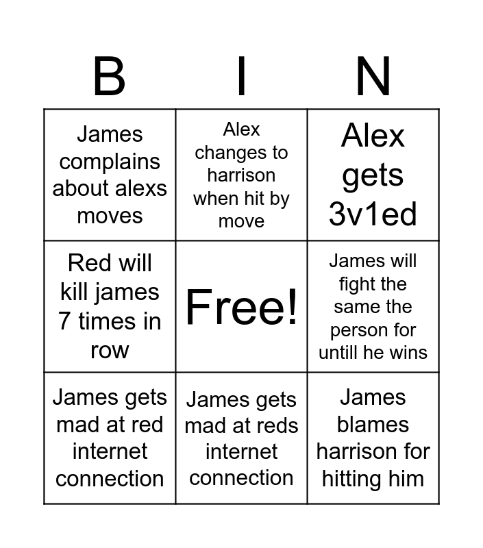 This bingo card has a free space and 9 words: James gets mad at red internet connection, Alex gets 3v1ed, Alex changes to harrison when hit by move, Red will kill james 7 times in row, James complains about alexs moves, James will fight the same the person for untill he wins, James blames harrison for hitting him, Harrison kills alex and James gets mad at reds internet connection.