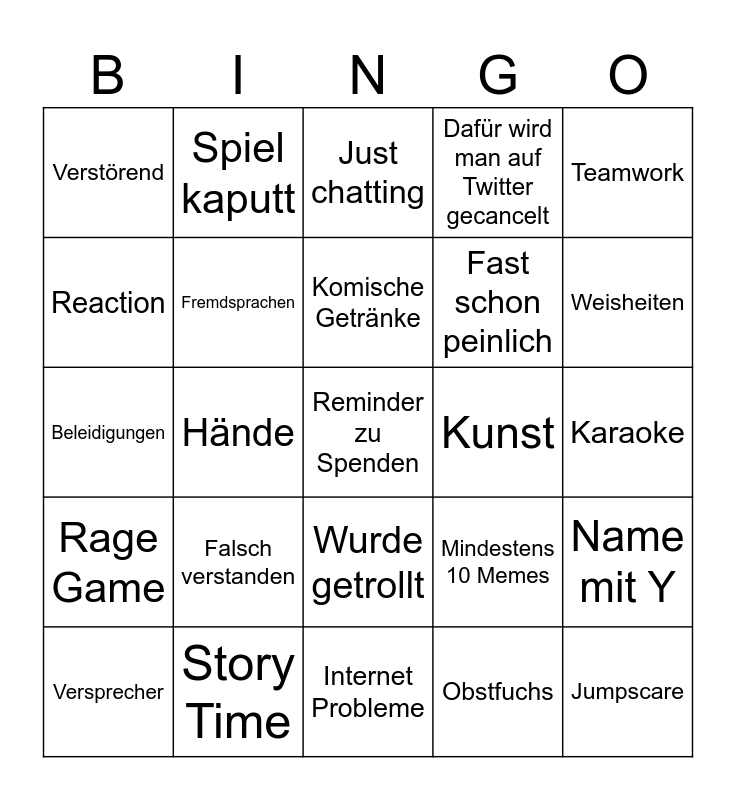 This bingo card has a free space and 24 words: Falsch verstanden, Story Time, Komische Getränke, Versprecher, Teamwork, Verstörend, Reaction, Spiel kaputt, Kunst, Wurde getrollt, Fast schon peinlich, Beleidigungen, Mindestens 10 Memes, Name mit Y, Fremdsprachen, Obstfuchs, Karaoke, Just chatting, Weisheiten, Hände, Jumpscare, Rage Game, Dafür wird man auf Twitter gecancelt and Internet Probleme.