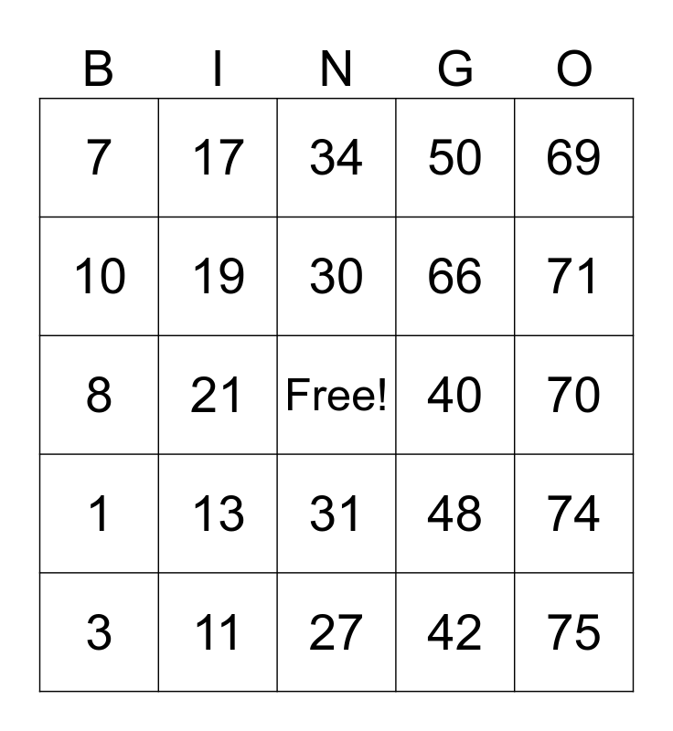 This bingo card has a free space and 24 words: 3, 13, 30, 42, 69, 7, 17, 34, 40, 70, 8, 19, 48, 74, 10, 11, 27, 50, 71, 1, 21, 31, 66 and 75.