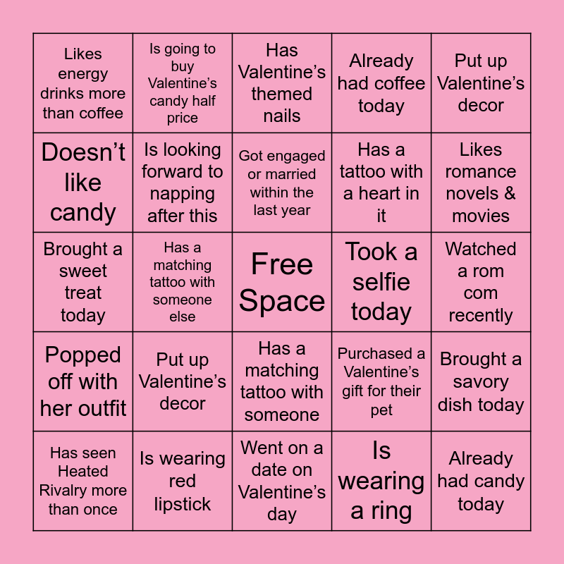 This bingo card has a free space and 27 words: Purchased a Valentine’s gift for their pet, Has already been to a Galentine’s party this year, Has a tattoo with a heart in it, Went on a date on Valentine’s day, Doesn’t like candy, Has Valentine’s themed nails, Is going to buy Valentine’s candy half price, Popped off with her outfit, Took a selfie today, Brought a savory dish today, Brought a sweet treat today, Already had coffee today, Has seen Heated Rivalry more than once, Is wearing red lipstick, Likes romance novels & movies, Is wearing Valentine’s themed jewelry, Is looking forward to napping after this, Got engaged or married within the last year, Put up Valentine’s decor, Likes energy drinks more than coffee, Watched a rom com recently, Is wearing a ring, Has a matching tattoo with someone else, Already had candy today, Has a matching tattoo with someone, Put up Valentine’s decor and Listened to a love song on the way here.