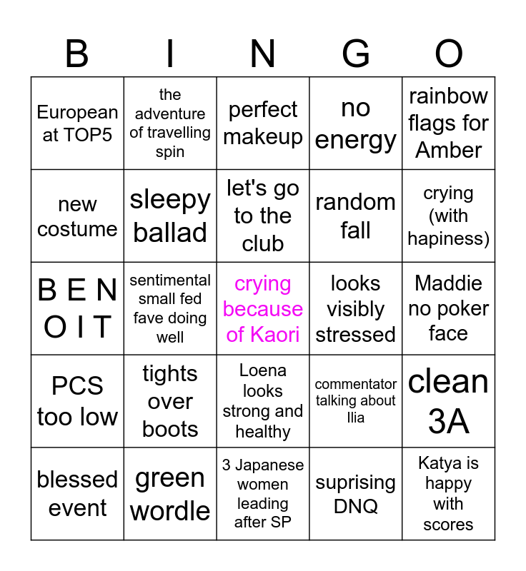 This bingo card has a free space and 28 words: clean 3A, warhorse, random fall, suprising DNQ, new costume, perfect makeup, the adventure of travelling spin, PCS too low, looks visibly stressed, blessed event, B E N O I T, no energy, green wordle, 3 Japanese women leading after SP, crying (with hapiness), time deduction, tights over boots, sleepy ballad, let's go to the club, Loena looks strong and healthy, European at TOP5, Jia lives, Katya is happy with scores, sentimental small fed fave doing well, Maddie no poker face, commentator talking about Ilia, rainbow flags for Amber and Alysa does something iconic.