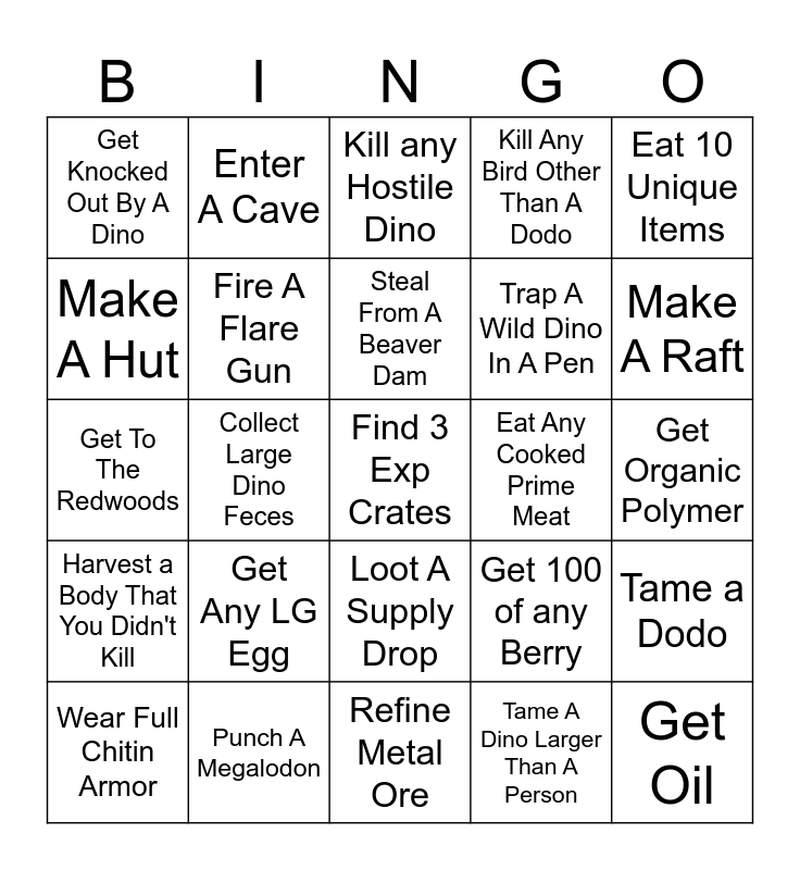 This bingo card has 27 words: Get 100 of any Berry, Get Oil, Trap A Wild Dino In A Pen, Refine Metal Ore, Make A Hut, Kill any Hostile Dino, Enter A Cave, Harvest a Body That You Didn't Kill, Eat Any Cooked Prime Meat, Tame a Dodo, Get To The Redwoods, Kill Any Bird Other Than A Dodo, Wear Full Chitin Armor, Punch A Megalodon, Make A Raft, Get To Any Obelisk, Fire A Flare Gun, Steal From A Beaver Dam, Get Any LG Egg, Get Knocked Out By A Dino, Get Organic Polymer, Tame A Dino Larger Than A Person, Collect Large Dino Feces, Find 3 Exp Crates, Loot A Supply Drop, Eat 10 Unique Items and Paint Something.