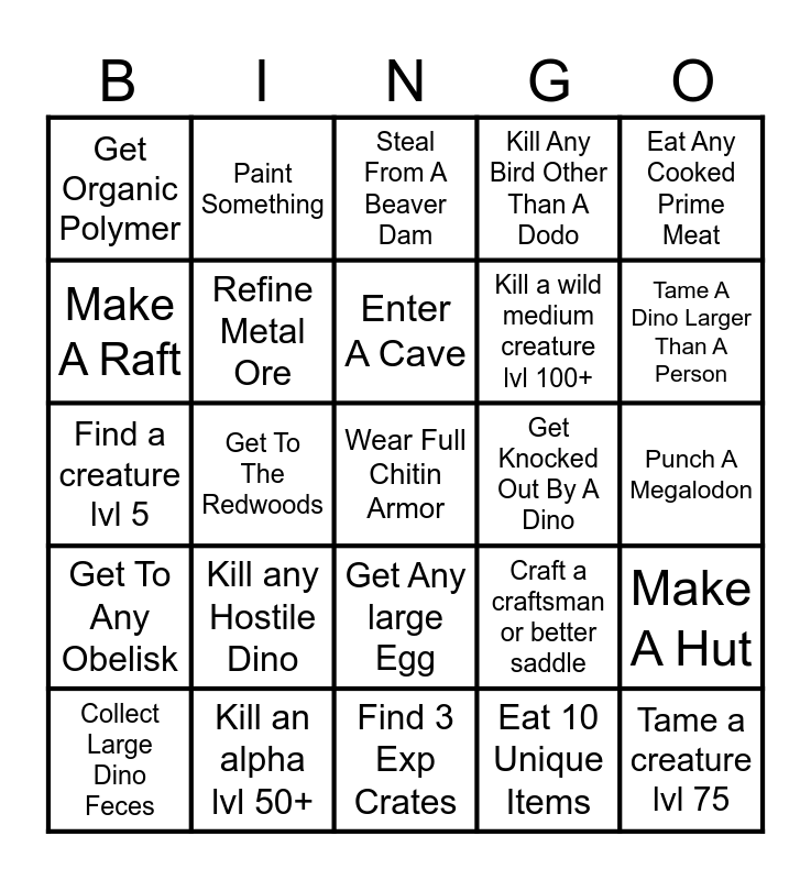 This bingo card has 37 words: Get 100 of any Berry, Get Oil, Trap A Wild Dino In A Pen, Refine Metal Ore, Make A Hut, Kill any Hostile Dino, Enter A Cave, Harvest a Body That You Didn't Kill, Eat Any Cooked Prime Meat, Tame a Dodo, Get To The Redwoods, Kill Any Bird Other Than A Dodo, Wear Full Chitin Armor, Punch A Megalodon, Make A Raft, Get To Any Obelisk, Fire A Flare Gun, Steal From A Beaver Dam, Get Any large Egg, Get Knocked Out By A Dino, Get Organic Polymer, Tame A Dino Larger Than A Person, Collect Large Dino Feces, Find 3 Exp Crates, Loot A Supply Drop, Eat 10 Unique Items, Paint Something, Die to a giganotosaurus, Find a red drop with a ring, Kill a dodo, Kill a carno with a pteranodon, Kill an alpha lvl 50+, Find a creature lvl 5, Tame a creature lvl 75, Craft a craftsman or better saddle, Kill a wild medium creature lvl 100+ and Tame and kill a dino.