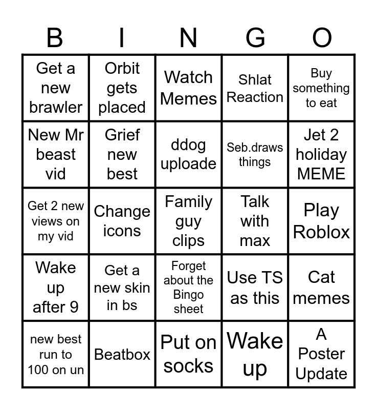 This bingo card has 30 words: Beatbox, Do the unknown wave, Change icons, LarrisGD Hating on swing short, Get a new brawler, Watch Memes, Grief new best, Forget about the Bingo sheet, Talk with max, Put on socks, Play Roblox, Family guy clips, Wake up, A Poster Update, Jet 2 holiday MEME, Ai slop, Use TS as this, Wake up after 9, Get a new skin in bs, Buy something to eat, Get 2 new views on my vid, Scroll youtbe shorts, Orbit gets placed, Seb.draws things, New Mr beast vid, Shlat Reaction, Cat memes, new best run to 100 on un, ddog uploade and Whystep verified.