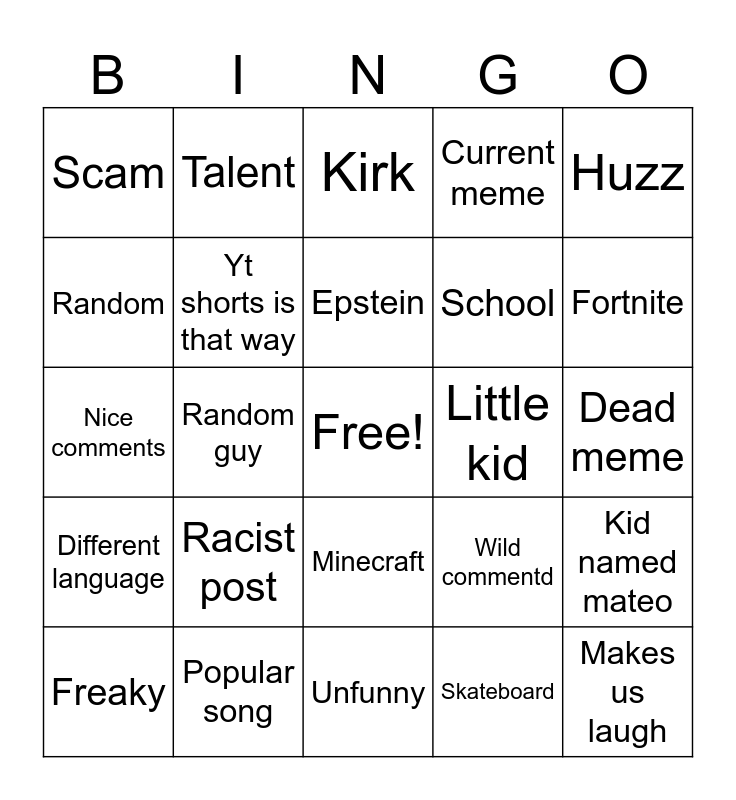 This bingo card has a free space and 24 words: Racist post, Popular song, Epstein, Freaky, Huzz, Scam, Random, Talent, Little kid, Minecraft, School, Nice comments, Wild commentd, Kid named mateo, Yt shorts is that way, Skateboard, Dead meme, Kirk, Fortnite, Random guy, Makes us laugh, Different language, Current meme and Unfunny.