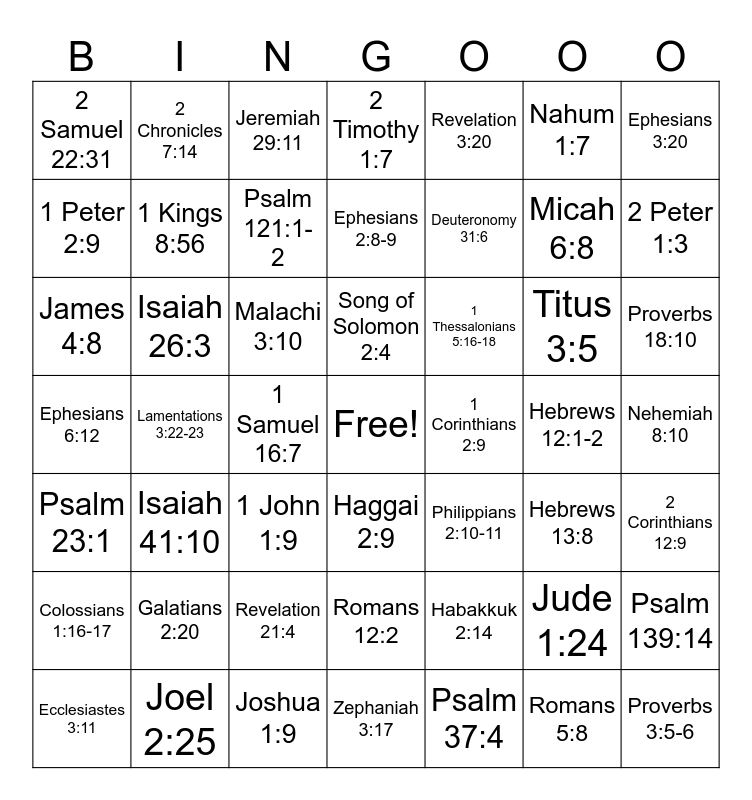 This bingo card has a free space and 48 words: Habakkuk 2:14, Micah 6:8, Zephaniah 3:17, Lamentations 3:22-23, Malachi 3:10, Nehemiah 8:10, 2 Chronicles 7:14, Joel 2:25, Nahum 1:7, Haggai 2:9, Ephesians 3:20, 2 Timothy 1:7, Titus 3:5, 1 Thessalonians 5:16-18, Colossians 1:16-17, Hebrews 12:1-2, 1 Peter 2:9, 2 Peter 1:3, Jude 1:24, Revelation 3:20, Deuteronomy 31:6, 1 Samuel 16:7, 2 Samuel 22:31, 1 Kings 8:56, Psalm 139:14, Psalm 121:1-2, Proverbs 18:10, Ecclesiastes 3:11, Song of Solomon 2:4, Isaiah 26:3, Romans 5:8, 1 Corinthians 2:9, 2 Corinthians 12:9, Galatians 2:20, Ephesians 6:12, Philippians 2:10-11, Hebrews 13:8, James 4:8, 1 John 1:9, Revelation 21:4, Psalm 23:1, Proverbs 3:5-6, Jeremiah 29:11, Joshua 1:9, Ephesians 2:8-9, Romans 12:2, Isaiah 41:10 and Psalm 37:4.