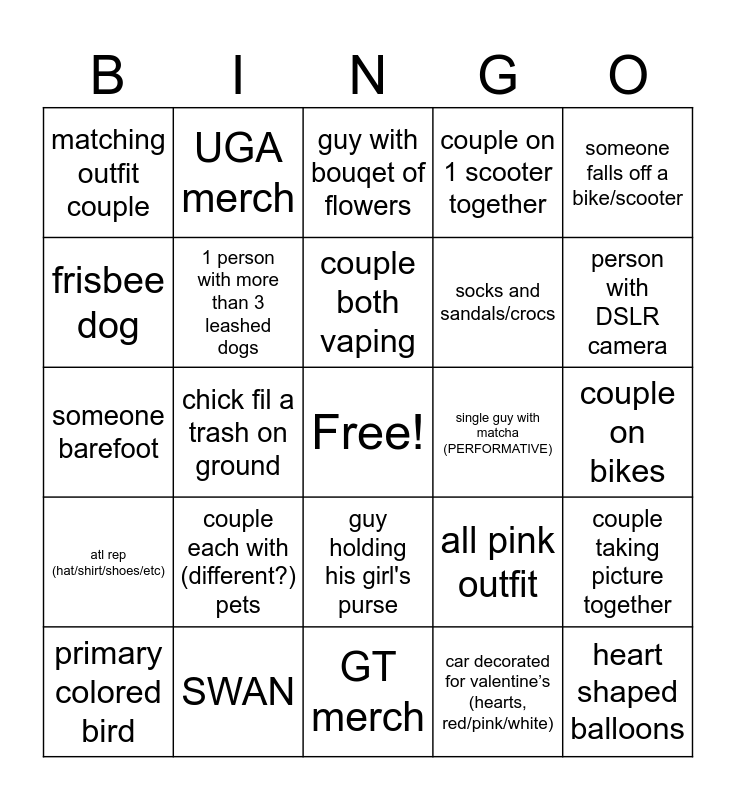 This bingo card has a free space and 24 words: couple each with (different?) pets, SWAN, couple both vaping, primary colored bird, someone falls off a bike/scooter, matching outfit couple, frisbee dog, UGA merch, single guy with matcha (PERFORMATIVE), guy holding his girl's purse, socks and sandals/crocs, someone barefoot, all pink outfit, couple taking picture together, 1 person with more than 3 leashed dogs, car decorated for valentine’s (hearts, red/pink/white), couple on bikes, guy with bouqet of flowers, person with DSLR camera, chick fil a trash on ground, heart shaped balloons, atl rep (hat/shirt/shoes/etc), couple on 1 scooter together and GT merch.
