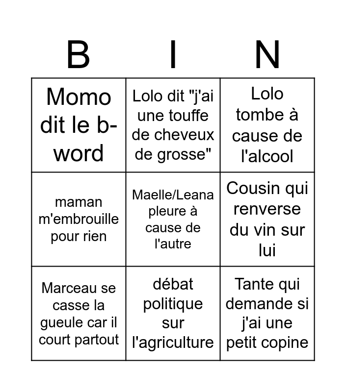 This bingo card has a free space and 8 words: Cousin qui renverse du vin sur lui, Lolo tombe à cause de l'alcool, Lolo dit "j'ai une touffe de cheveux de grosse", Marceau se casse la gueule car il court partout, Momo dit le b-word, Tante qui demande si j'ai une petit copine, maman m'embrouille pour rien and débat politique sur l'agriculture.