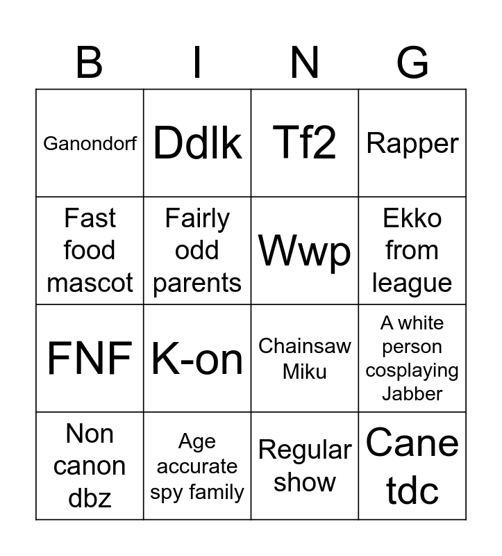 This bingo card has 16 words: Age accurate spy family, A white person cosplaying Jabber, Tf2, Ganondorf, FNF, Ddlk, Chainsaw Miku, Regular show, Fast food mascot, Fairly odd parents, Non canon dbz, Rapper, K-on, Ekko from league, Wwp and Cane tdc.