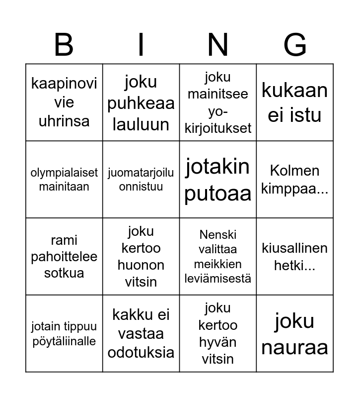 This bingo card has 22 words: kakku ei vastaa odotuksia, joku käy vessassa, joku puhkeaa lauluun, Hepuli :D, juomatarjoilu onnistuu, jotakin putoaa, kaapinovi vie uhrinsa, joku mainitsee yo-kirjoitukset, Nenski valittaa meikkien leviämisestä, joku nauraa, rami pahoittelee sotkua, kukaan ei istu, vieraat kursailevat, joku "kärsii", joku kertoo hyvän vitsin, yläkerrasta kuuluu ääniä, kiusallinen hetki..., jotain tippuu pöytäliinalle, joku kertoo huonon vitsin, olympialaiset mainitaan, Kolmen kimppaa... and joku vieraista on pelastava enkeli.