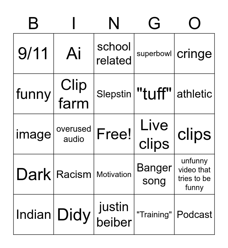 This bingo card has a free space and 24 words: Racism, Didy, Slepstin, Indian, cringe, 9/11, funny, Ai, Live clips, Motivation, "tuff", image, Banger song, unfunny video that tries to be funny, Clip farm, "Training", clips, school related, athletic, overused audio, Podcast, Dark, superbowl and justin beiber.