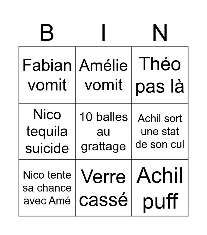 This bingo card has a free space and 8 words: Achil sort une stat de son cul, Théo pas là, Amélie vomit, Nico tente sa chance avec Amé, Fabian vomit, Achil puff, Nico tequila suicide and Verre cassé.