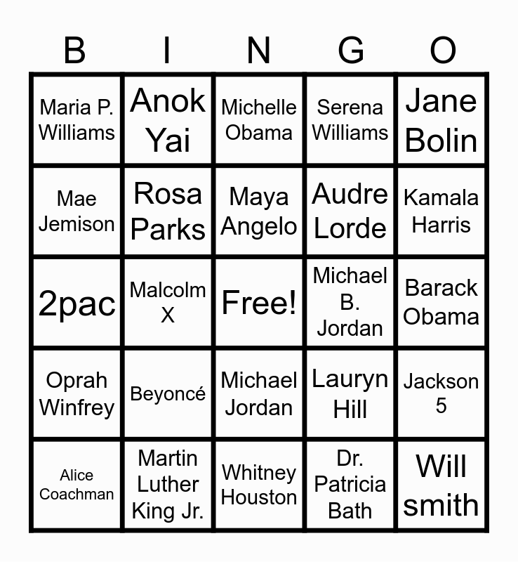 This bingo card has a free space and 24 words: Beyoncé, Martin Luther King Jr., Maya Angelo, Alice Coachman, Jane Bolin, Maria P. Williams, Mae Jemison, Anok Yai, Michael B. Jordan, Michael Jordan, Audre Lorde, 2pac, Lauryn Hill, Jackson 5, Rosa Parks, Dr. Patricia Bath, Barack Obama, Michelle Obama, Kamala Harris, Malcolm X, Will smith, Oprah Winfrey, Serena Williams and Whitney Houston.