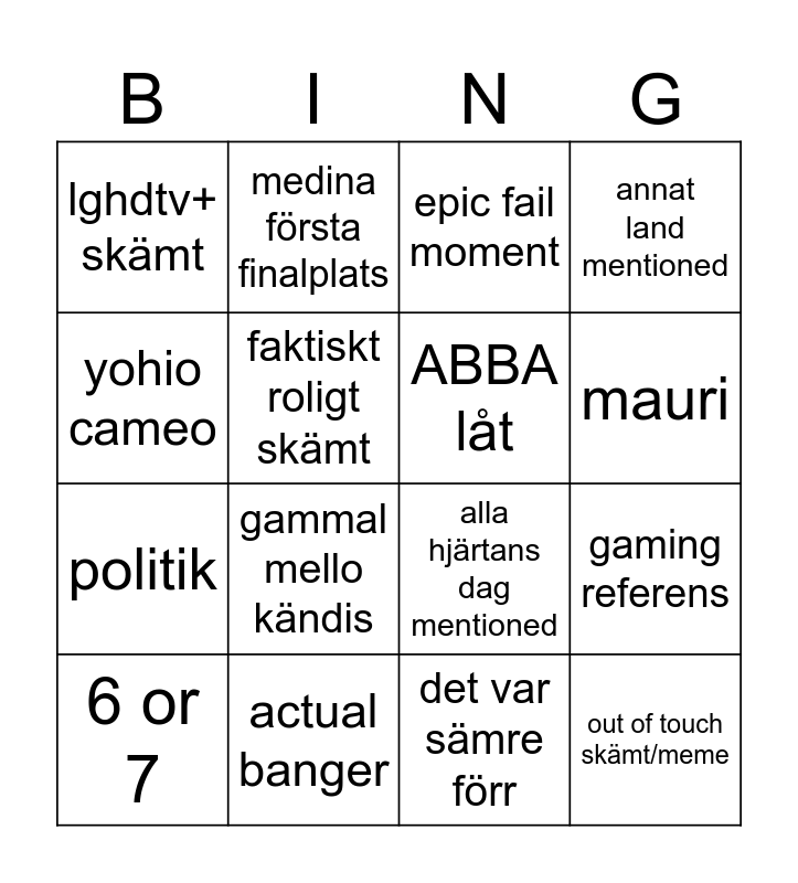 This bingo card has 16 words: actual banger, gaming referens, epic fail moment, lghdtv+ skämt, politik, medina första finalplats, alla hjärtans dag mentioned, det var sämre förr, yohio cameo, faktiskt roligt skämt, 6 or 7, annat land mentioned, gammal mello kändis, mauri, ABBA låt and out of touch skämt/meme.