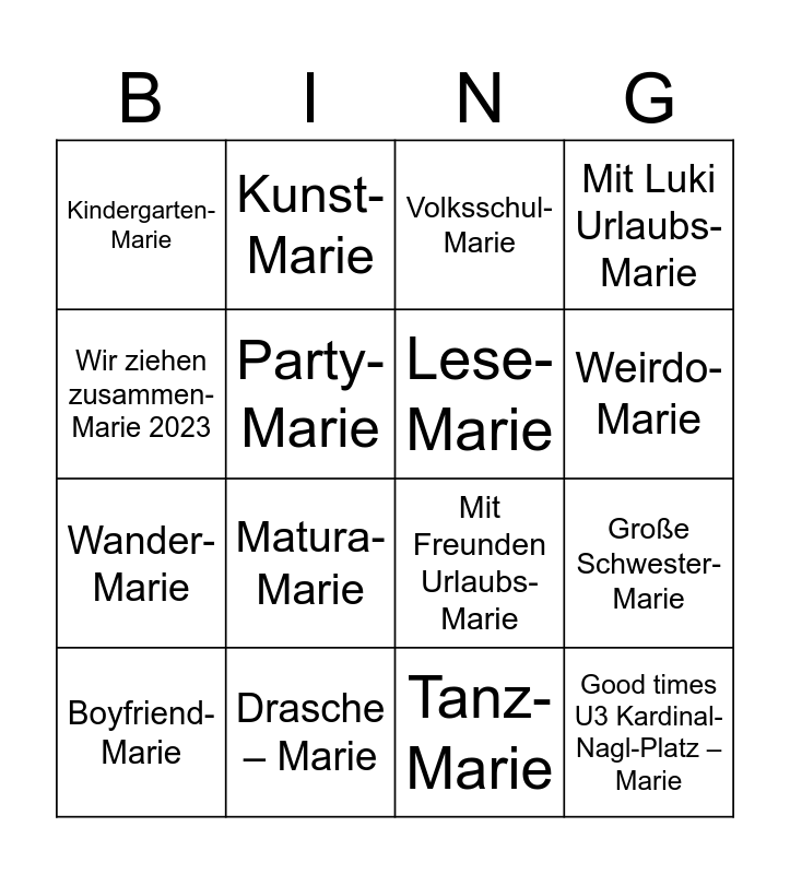 This bingo card has 31 words: Free!, Baby-Marie, Große Schwester-Marie, Familienurlaub- Marie, Kindergarten-Marie, Volksschul-Marie, Lese-Marie, Unterstufen-Marie, Drasche – Marie, Sweethearts-Marie, Tanz-Marie, Boyfriend-Marie, Schulball- und Ride-Club Marie, Italienisch-Marie, Matura-Marie, Besuchs-Marie, „Dreier“ WG-Marie, Harley -Marie, Good times U3 Kardinal-Nagl-Platz – Marie, Tattoo-Marie, Wir ziehen zusammen-Marie 2023, Lauf-Marie, Kinderkurs-Marie, Kunst-Marie, Wander-Marie, Party-Marie, Mit Luki Urlaubs-Marie, Mit Freunden Urlaubs-Marie, Kletter-Marie, Weirdo-Marie and Beste Freundin – Marie.
