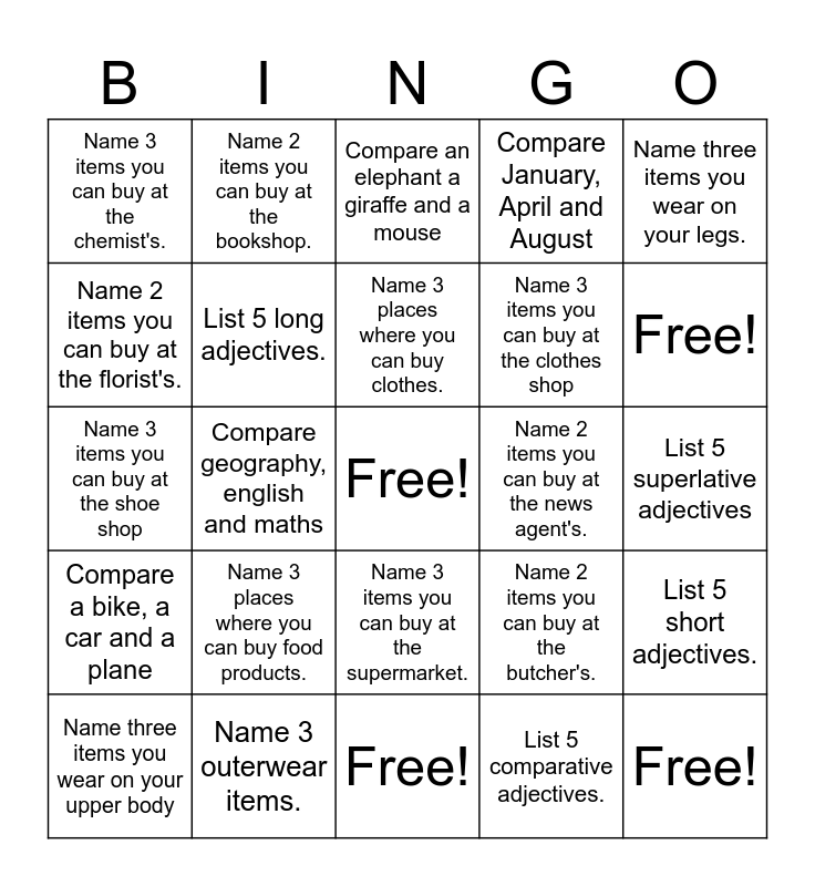 This bingo card has a free space and 24 words: Name 3 places where you can buy food products., Name 3 outerwear items., Name 3 places where you can buy clothes., Name three items you wear on your upper body, Name three items you wear on your legs., Name 3 items you can buy at the chemist's., Name 2 items you can buy at the florist's., Name 2 items you can buy at the bookshop., Name 2 items you can buy at the news agent's., Name 3 items you can buy at the supermarket., Name 3 items you can buy at the clothes shop, Name 3 items you can buy at the shoe shop, Name 2 items you can buy at the butcher's., List 5 short adjectives., List 5 long adjectives., List 5 comparative adjectives., List 5 superlative adjectives, Compare an elephant a giraffe and a mouse, Free!, Compare geography, english and maths, Free!, Compare a bike, a car and a plane, Compare January, April and August and Free!.