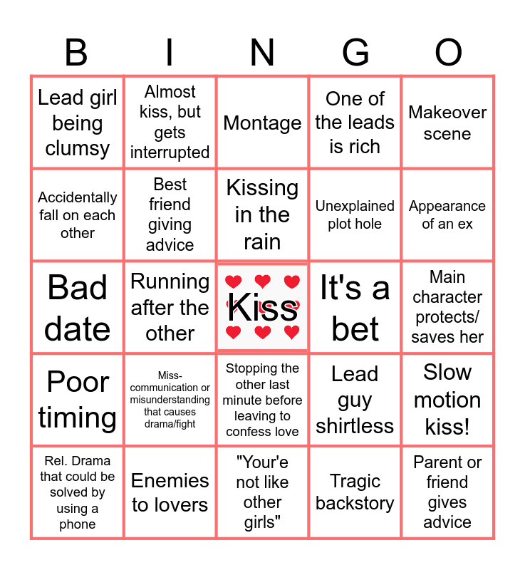 This bingo card has a free space and 34 words: Trouble saying I Love You, Tragic backstory, quirky or gay BFF, Love triangle, Poor timing, Best friend giving advice, Makeover scene, Rel. Drama that could be solved by using a phone, Almost kiss, but gets interrupted, A lie is revealed, Kissing in the rain, Montage, Singing in public to profess love, She's independent and doesn't want a bf, It's a bet, Appearance of an ex, Enemies to lovers, Bad date, Miss-communication or misunderstanding that causes drama/fight, Lead guy shirtless, Stopping the other last minute before leaving to confess love, breakup wine or ice cream session in PJ's, Lead girl being clumsy, Main character protects/ saves her, "Your'e not like other girls", Parent or friend gives advice, One of the leads is rich, Love at first sight (in awe stare), Unexplained plot hole, Accidentally fall on each other, A lie is revealed, Running after the other, Slow motion kiss! and Secondary characters get together.