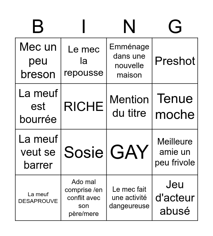 This bingo card has 16 words: Ado mal comprise /en conflit avec son père/mere, Meilleure amie un peu frivole, Emménage dans une nouvelle maison, Mec un peu breson, La meuf veut se barrer, Le mec la repousse, GAY, Le mec fait une activité dangeureuse, La meuf est bourrée, RICHE, La meuf DESAPROUVE, Preshot, Sosie, Tenue moche, Mention du titre and Jeu d'acteur abusé.