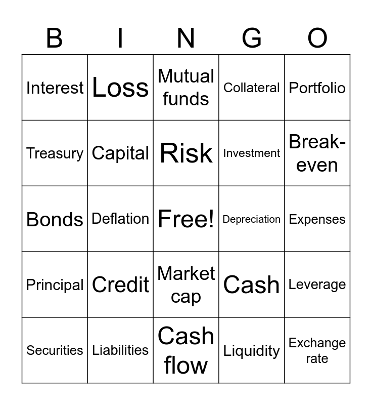 This bingo card has a free space and 50 words: Assets, Liabilities, Equity, Revenue, Expenses, Profit, Loss, Budget, Investment, Dividend, Interest, Capital, Cash flow, Liquidity, Solvency, Inflation, Deflation, Risk, Return, Portfolio, Bonds, Stocks, Mutual funds, Depreciation, Amortization, Principal, Credit, Debt, Collateral, Leverage, Margin, Hedge, Derivatives, Futures, Options, Securities, Yield, Net worth, Working capital, Break-even, Forecasting, Valuation, Market cap, Index, Exchange rate, Treasury, Annuity, Insurance, Cash and Bankruptcy.