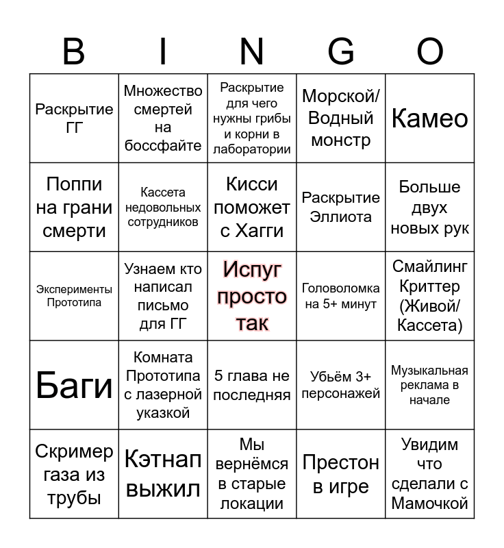 This bingo card has a free space and 24 words: Комната Прототипа с лазерной указкой, Кэтнап выжил, Кисси поможет с Хагги, Скример газа из трубы, Камео, Раскрытие ГГ, Поппи на грани смерти, Множество смертей на боссфайте, Головоломка на 5+ минут, 5 глава не последняя, Раскрытие Эллиота, Эксперименты Прототипа, Убьём 3+ персонажей, Музыкальная реклама в начале, Кассета недовольных сотрудников, Престон в игре, Смайлинг Криттер (Живой/Кассета), Раскрытие для чего нужны грибы и корни в лаборатории, Больше двух новых рук, Узнаем кто написал письмо для ГГ, Увидим что сделали с Мамочкой, Баги, Морской/Водный монстр and Мы вернёмся в старые локации.