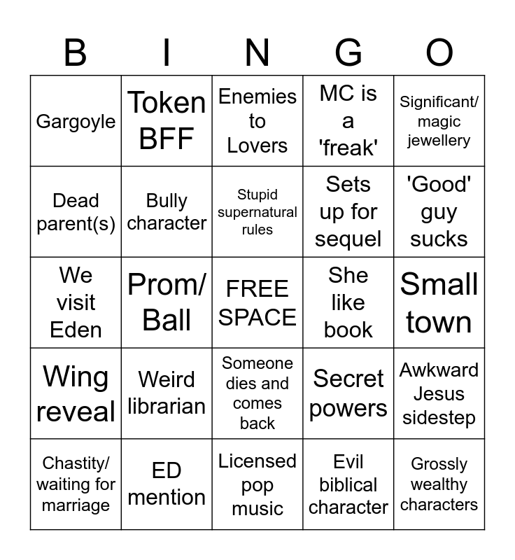 This bingo card has a free space and 24 words: Weird librarian, ED mention, Stupid supernatural rules, Chastity/ waiting for marriage, Significant/ magic jewellery, Gargoyle, Dead parent(s), Token BFF, She like book, Someone dies and comes back, Sets up for sequel, We visit Eden, Secret powers, Awkward Jesus sidestep, Bully character, Evil biblical character, Small town, Enemies to Lovers, 'Good' guy sucks, Prom/ Ball, Grossly wealthy characters, Wing reveal, MC is a 'freak' and Licensed pop music.