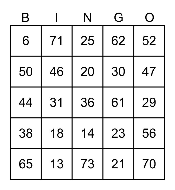 This bingo card has 25 words: 18, 73, 20, 65, 52, 6, 50, 71, 61, 14, 30, 44, 23, 56, 46, 70, 29, 25, 47, 31, 36, 13, 38, 62 and 21.