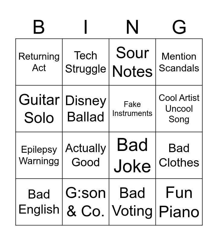 This bingo card has 16 words: G:son & Co., Bad Clothes, Sour Notes, Returning Act, Epilepsy Warningg, Tech Struggle, Bad Joke, Bad Voting, Guitar Solo, Disney Ballad, Bad English, Mention Scandals, Actually Good, Cool Artist Uncool Song, Fake Instruments and Fun Piano.