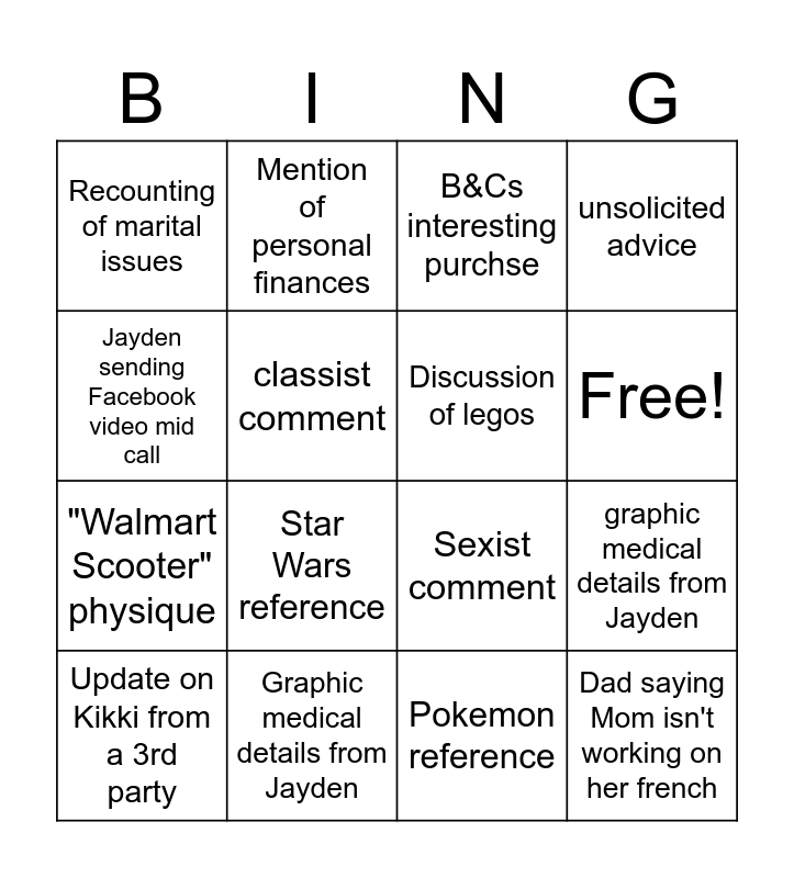 This bingo card has 18 words: Star Wars reference, Dad saying Mom isn't working on her french, B&Cs interesting purchse, Recounting of marital issues, Sexist comment, unsolicited advice, Update on Kikki from a 3rd party, Mention of personal finances, Free!, "Walmart Scooter" physique, Pokemon reference, Jayden sending Facebook video mid call, graphic medical details from Jayden, classist comment, Discussion of legos, Racist comment, Graphic medical details from Jayden and Unsolicited advice.