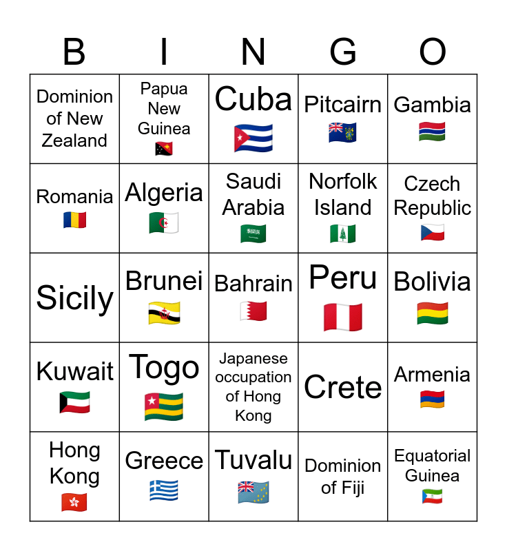 This bingo card has a free space and 283 words: Afghanistan ๐ฆ๐ซ, Albania ๐ฆ๐ฑ, Algeria ๐ฉ๐ฟ, Andorra ๐ฆ๐ฉ, Angola ๐ฆ๐ด, Antigua and Barbuda ๐ฆ๐ฌ, Argentina ๐ฆ๐ท, Armenia ๐ฆ๐ฒ, Australia ๐ฆ๐บ, Austria ๐ฆ๐น, Azerbaijan ๐ฆ๐ฟ, Bahamas ๐ง๐ธ, Bangladesh ๐ง๐ฉ, Barbados ๐ง๐ง, Belarus ๐ง๐พ, Belgium ๐ง๐ช, Belize ๐ง๐ฟ, Benin ๐ง๐ฏ, Bermuda ๐ง๐ฒ, Bhutan ๐ง๐น, Bolivia ๐ง๐ด, Bosnia and Herzegovina ๐ง๐ฆ, Botswana ๐ง๐ผ, Brazil ๐ง๐ท, Brunei ๐ง๐ณ, Bulgaria ๐ง๐ฌ, Burkina Faso ๐ง๐ซ, Burundi ๐ง๐ฎ, Cambodia ๐ฐ๐ญ, Cameroon ๐จ๐ฒ, Canada ๐จ๐ฆ, Cape Verde ๐จ๐ป, Cayman Islands ๐ฐ๐พ, Central African Republic ๐จ๐ซ, Chad ๐น๐ฉ, Chile ๐จ๐ฑ, China ๐จ๐ณ, Christmas Island ๐จ๐ฝ, Cocos (Keeling) Islands ๐จ๐จ, Colombia ๐จ๐ด, Comoros ๐ฐ๐ฒ, Congo (Republic) ๐จ๐ฌ, Congo (Democrat) ๐จ๐ฉ, Cook Islands ๐จ๐ฐ, Costa Rica ๐จ๐ท, Croatia ๐ญ๐ท, Cuba ๐จ๐บ, Curaรงao ๐จ๐ผ, Cyprus ๐จ๐พ, Czech Republic ๐จ๐ฟ, Denmark ๐ฉ๐ฐ, Djibouti ๐ฉ๐ฏ, Dominica ๐ฉ๐ฒ, Dominican Republic ๐ฉ๐ด, Ecuador ๐ช๐จ, Egypt ๐ช๐ฌ, El Salvador ๐ธ๐ป, Equatorial Guinea ๐ฌ๐ถ, Eritrea ๐ช๐ท, Estonia ๐ช๐ช, Ethiopia ๐ช๐น, European Union ๐ช๐บ, Faroe Islands ๐ซ๐ด, Fiji ๐ซ๐ฏ, Finland ๐ซ๐ฎ, France ๐ซ๐ท, Gabon ๐ฌ๐ฆ, Gambia ๐ฌ๐ฒ, Georgia ๐ฌ๐ช, Germany ๐ฉ๐ช, Ghana ๐ฌ๐ญ, Gibraltar ๐ฌ๐ฎ, Greece ๐ฌ๐ท, Greenland ๐ฌ๐ฑ, Grenada ๐ฌ๐ฉ, Guam ๐ฌ๐บ, Guatemala ๐ฌ๐น, Guinea ๐ฌ๐ณ, Guinea-Bissau ๐ฌ๐ผ, Guyana ๐ฌ๐พ, Haiti ๐ญ๐น, Honduras ๐ญ๐ณ, Hong Kong ๐ญ๐ฐ, Hungary ๐ญ๐บ, Iceland ๐ฎ๐ธ, India ๐ฎ๐ณ, Indonesia ๐ฎ๐ฉ, Iran ๐ฎ๐ท, Iraq ๐ฎ๐ถ, Ireland ๐ฎ๐ช, Isle of Man ๐ฎ๐ฒ, Israel ๐ฎ๐ฑ, Italy ๐ฎ๐น, Ivory Coast ๐จ๐ฎ, Jamaica ๐ฏ๐ฒ, Japan ๐ฏ๐ต, Jordan ๐ฏ๐ด, Kazakhstan ๐ฐ๐ฟ, Kenya ๐ฐ๐ช, Kiribati ๐ฐ๐ฎ, Kosovo ๐ฝ๐ฐ, Kuwait ๐ฐ๐ผ, Kyrgyzstan ๐ฐ๐ฌ, Laos ๐ฑ๐ฆ, Latvia ๐ฑ๐ป, Lebanon ๐ฑ๐ง, Lesotho ๐ฑ๐ธ, Liberia ๐ฑ๐ท, Libya ๐ฑ๐พ, Liechtenstein ๐ฑ๐ฎ, Lithuania ๐ฑ๐น, Luxembourg ๐ฑ๐บ, Macau ๐ฒ๐ด, Madagascar ๐ฒ๐ฌ, Malawi ๐ฒ๐ผ, Malaysia ๐ฒ๐พ, Maldives ๐ฒ๐ป, Mali ๐ฒ๐ฑ, Malta ๐ฒ๐น, Marshall Islands ๐ฒ๐ญ, Martinique ๐ฒ๐ถ, Mauritania ๐ฒ๐ท, Mauritius ๐ฒ๐บ, Mexico ๐ฒ๐ฝ, Micronesia ๐ซ๐ฒ, Moldova ๐ฒ๐ฉ, Monaco ๐ฒ๐จ, Mongolia ๐ฒ๐ณ, Montenegro ๐ฒ๐ช, Morocco ๐ฒ๐ฆ, Mozambique ๐ฒ๐ฟ, Myanmar (Burma) ๐ฒ๐ฒ, Namibia ๐ณ๐ฆ, Nauru ๐ณ๐ท, Nepal ๐ณ๐ต, Netherlands ๐ณ๐ฑ, New Caledonia ๐ณ๐จ, New Zealand ๐ณ๐ฟ, Nicaragua ๐ณ๐ฎ, Niger ๐ณ๐ช, Nigeria ๐ณ๐ฌ, Niue ๐ณ๐บ, Norfolk Island ๐ณ๐ซ, North Korea ๐ฐ๐ต, North Macedonia ๐ฒ๐ฐ, Northern Mariana Islands ๐ฒ๐ต, Norway ๐ณ๐ด, Oman ๐ด๐ฒ, Pakistan ๐ต๐ฐ, Palau ๐ต๐ผ, Palestine ๐ต๐ธ, Panama ๐ต๐ฆ, Papua New Guinea ๐ต๐ฌ, Paraguay ๐ต๐พ, Peru ๐ต๐ช, Philippines ๐ต๐ญ, Pitcairn ๐ต๐ณ, Poland ๐ต๐ฑ, Portugal ๐ต๐น, Puerto Rico ๐ต๐ท, Qatar ๐ถ๐ฆ, Romania ๐ท๐ด, Russia ๐ท๐บ, Rwanda ๐ท๐ผ, Saint Kitts and Nevis ๐ฐ๐ณ, Saint Lucia ๐ฑ๐จ, Saint Vincent and the Grenadines ๐ป๐จ, Samoa ๐ผ๐ธ, San Marino ๐ธ๐ฒ, Sรฃo Tomรฉ and Principe ๐ธ๐น, Saudi Arabia ๐ธ๐ฆ, Senegal ๐ธ๐ณ, Serbia ๐ท๐ธ, Seychelles ๐ธ๐จ, Sierra Leone ๐ธ๐ฑ, Singapore ๐ธ๐ฌ, Slovakia ๐ธ๐ฐ, Slovenia ๐ธ๐ฎ, Solomon Islands ๐ธ๐ง, Somalia ๐ธ๐ด, South Africa ๐ฟ๐ฆ, South Korea ๐ฐ๐ท, South Sudan ๐ธ๐ธ, Spain ๐ช๐ธ, Sri Lanka ๐ฑ๐ฐ, Sudan ๐ธ๐ฉ, Suriname ๐ธ๐ท, Sweden ๐ธ๐ช, Switzerland ๐จ๐ญ, Syria ๐ธ๐พ, Taiwan ๐น๐ผ, Tajikistan ๐น๐ฏ, Tanzania ๐น๐ฟ, Thailand ๐น๐ญ, Timor-Leste ๐น๐ฑ, Togo ๐น๐ฌ, Tonga ๐น๐ด, Trinidad and Tobago ๐น๐น, Tunisia ๐น๐ณ, Turkey ๐น๐ท, Turkmenistan ๐น๐ฒ, Tuvalu ๐น๐ป, Uganda ๐บ๐ฌ, Ukraine ๐บ๐ฆ, United Arab Emirates ๐ฆ๐ช, United Kingdom ๐ฌ๐ง, United States of America ๐บ๐ธ, Uruguay ๐บ๐พ, Uzbekistan ๐บ๐ฟ, Vanuatu ๐ป๐บ, Vatican City ๐ป๐ฆ, Venezuela ๐ป๐ช, Vietnam ๐ป๐ณ, Virgin Islands ๐ป๐ฌ ๐ป๐ฎ, Western Sahara ๐ช๐ญ, Yemen ๐พ๐ช, Zambia ๐ฟ๐ฒ, Zimbabwe ๐ฟ๐ผ, Scotland ๐ด๓ ง๓ ข๓ ณ๓ ฃ๓ ด๓ ฟ, Putrajaya, Antarctica ๐ฆ๐ถ, NATO, Abkhazia, Northern Cyprus, South Ossetia, Yugoslavia, Basque Country, Bavaria, Sovereign Military Order of Malta, Transnistria, Zanzibar, Catalonia, Sicily, Serbia and Montenegro, ASEAN, Qing dynasty, Kingdom of Siam, Crown Colony of Sarawak, Kingdom of Yugoslavia, USSR, Old Republic of South Africa, Aland Islands ๐ฆ๐ฝ, Canary Islands ๐ฎ๐จ, British Hong Kong, Dominion of India, Dominion of Pakistan, Dominion of New England, Dominion of Fiji, Dominion of Ghana, Dominion of New Zealand, Dominion of Ceylon, Dominion of Canada, Democratic Kampuchea, Dominion of Newfoundland, Hawaii, Quebec, Bougai