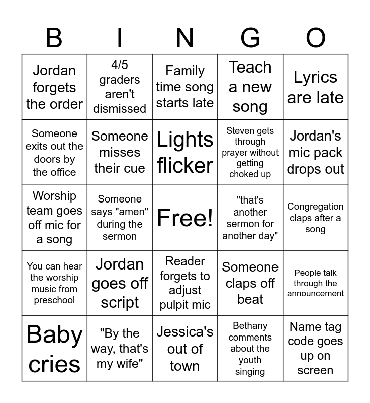 This bingo card has a free space and 24 words: Jordan goes off script, "By the way, that's my wife", Lights flicker, Baby cries, Lyrics are late, Jordan forgets the order, Someone exits out the doors by the office, 4/5 graders aren't dismissed, "that's another sermon for another day", Reader forgets to adjust pulpit mic, Steven gets through prayer without getting choked up, Worship team goes off mic for a song, Someone claps off beat, People talk through the announcement, Someone misses their cue, Bethany comments about the youth singing, Congregation claps after a song, Family time song starts late, Jordan's mic pack drops out, Someone says "amen" during the sermon, Name tag code goes up on screen, You can hear the worship music from preschool, Teach a new song and Jessica's out of town.