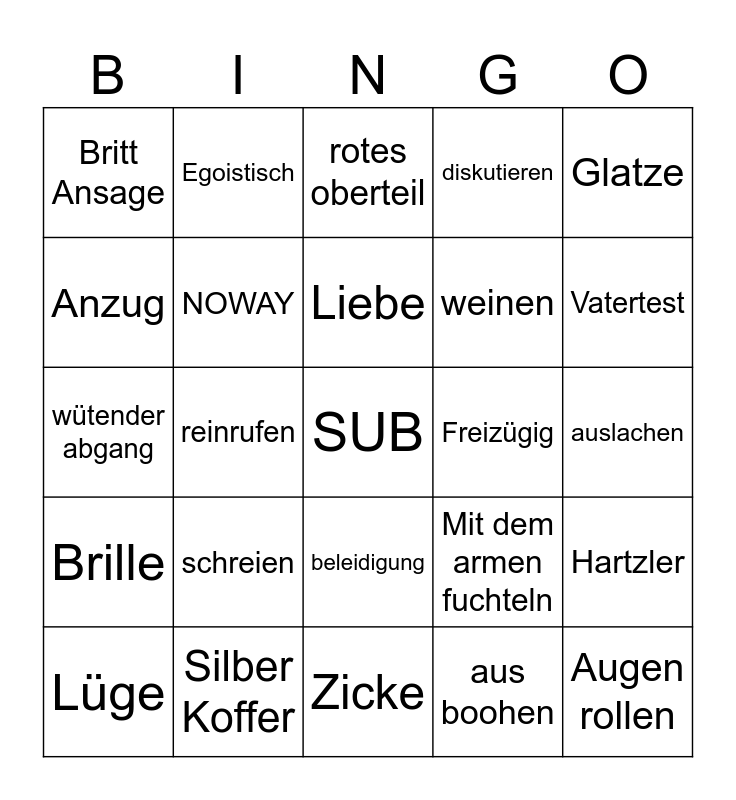 This bingo card has a free space and 24 words: schreien, Silber Koffer, Liebe, Lüge, Glatze, Britt Ansage, Anzug, Egoistisch, Freizügig, beleidigung, weinen, wütender abgang, Mit dem armen fuchteln, Hartzler, NOWAY, aus boohen, auslachen, rotes oberteil, Vatertest, reinrufen, Augen rollen, Brille, diskutieren and Zicke.