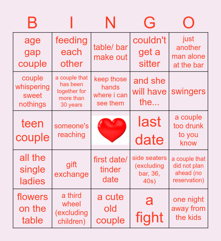 This bingo card has a free space and 30 words: a third wheel (excluding children), a phone couple, someone's reaching, a couple refusing to move their holding hands when their food arrives, age gap couple, table/ bar make out, a couple that has been together for more than 30 years, first date/ tinder date, last date, a cute old couple, a couple too drunk to you know, one night away from the kids, a fight, throuple? or looking for a third, swingers, costumes, side seaters (excluding bar, 36, 40s), all the single ladies, gift exchange, just another man alone at the bar, teen couple, one high couple, feeding each other, and she will have the..., couple whispering sweet nothings, couldn't get a sitter, a couple that did not plan ahead (no reservation), flowers on the table, keep those hands where i can see them and only one person be dressin.