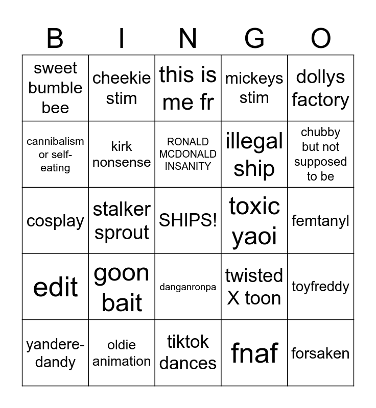 This bingo card has a free space and 29 words: yandere-dandy, random video in halfway mark, stalker sprout, phonk, sweet bumble bee, this is me fr, kirk nonsense, goon bait, toxic yaoi, oldie animation, femtanyl, forsaken, tiktok dances, fnaf, chubby but not supposed to be, useless astro, danganronpa, edit, dollys factory, cosplay, twisted X toon, flashing lights warning, illegal ship, cannibalism or self-eating, mickeys stim, cheekie stim, toyfreddy, RONALD MCDONALD INSANITY and trump.