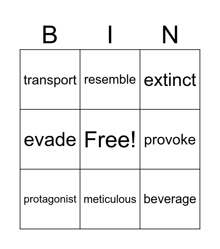 This bingo card has a free space and 8 words: provoke, extinct, resemble, protagonist, transport, beverage, evade and meticulous.