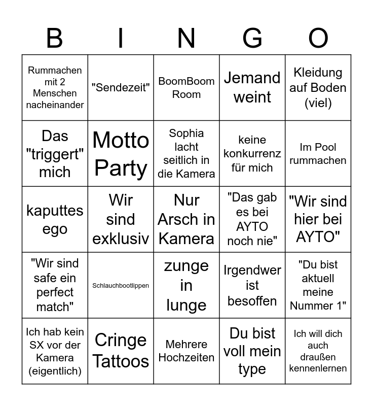 This bingo card has 25 words: Schlauchbootlippen, Mehrere Hochzeiten, Sophia lacht seitlich in die Kamera, Ich hab kein SX vor der Kamera (eigentlich), Kleidung auf Boden (viel), Rummachen mit 2 Menschen nacheinander, Das "triggert" mich, "Sendezeit", "Das gab es bei AYTO noch nie", zunge in lunge, keine konkurrenz für mich, kaputtes ego, Irgendwer ist besoffen, "Du bist aktuell meine Nummer 1", Motto Party, Ich will dich auch draußen kennenlernen, "Wir sind hier bei AYTO", BoomBoom Room, Im Pool rummachen, Wir sind exklusiv, Nur Arsch in Kamera, Cringe Tattoos, "Wir sind safe ein perfect match", Jemand weint and Du bist voll mein type.