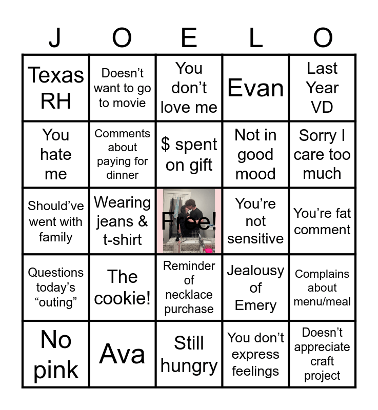 This bingo card has a free space and 24 words: The cookie!, Ava, $ spent on gift, No pink, Last Year VD, Texas RH, You hate me, Doesn’t want to go to movie, You’re not sensitive, Reminder of necklace purchase, Not in good mood, Should’ve went with family, Jealousy of Emery, Complains about menu/meal, Comments about paying for dinner, You don’t express feelings, You’re fat comment, You don’t love me, Sorry I care too much, Wearing jeans & t-shirt, Doesn’t appreciate craft project, Questions today’s “outing”, Evan and Still hungry.