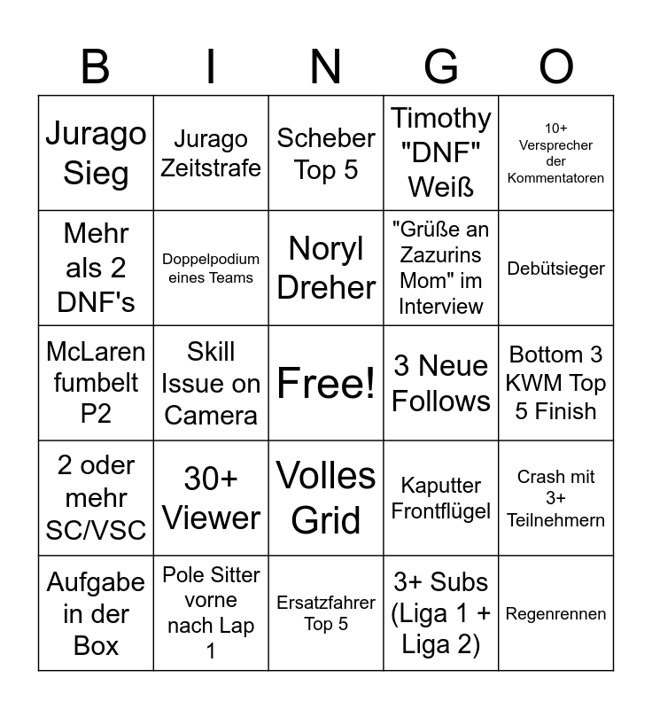 This bingo card has a free space and 24 words: Aufgabe in der Box, 30+ Viewer, Noryl Dreher, 3+ Subs (Liga 1 + Liga 2), 10+ Versprecher der Kommentatoren, Jurago Sieg, Jurago Zeitstrafe, Scheber Top 5, 3 Neue Follows, Bottom 3 KWM Top 5 Finish, McLaren fumbelt P2, Doppelpodium eines Teams, Kaputter Frontflügel, Crash mit 3+ Teilnehmern, Mehr als 2 DNF's, Pole Sitter vorne nach Lap 1, Ersatzfahrer Top 5, Timothy "DNF" Weiß, Debütsieger, 2 oder mehr SC/VSC, Skill Issue on Camera, Volles Grid, "Grüße an Zazurins Mom" im Interview and Regenrennen.