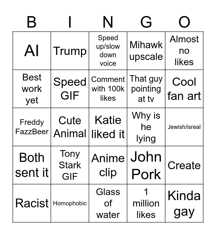 This bingo card has a free space and 29 words: Racist, Persona, Cute Animal, Epstine, AI, Speed up/slow down voice, Speed GIF, Tony Stark GIF, Why is he lying, Homophobic, Jewish/isreal, Kinda gay, Glass of water, 1 million likes, Cool fan art, Edit, Anime clip, Both sent it, Almost no likes, Freddy FazzBeer, John Pork, N Word, That guy pointing at tv, Best work yet, Mihawk upscale, Trump, Create, Comment with 100k likes and Comment ratio.