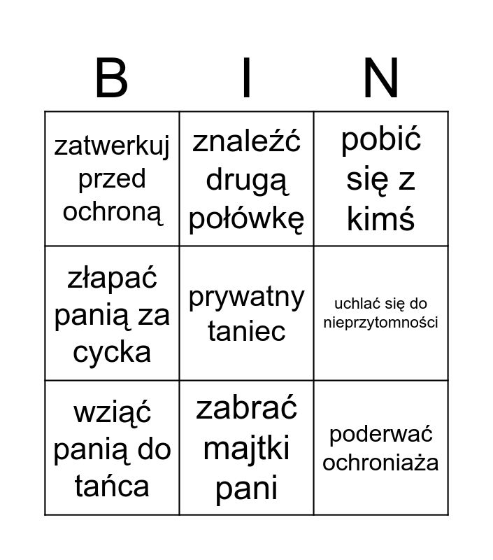 This bingo card has a free space and 8 words: uchlać się do nieprzytomności, pobić się z kimś, znaleźć drugą połówkę, wziąć panią do tańca, zatwerkuj przed ochroną, poderwać ochroniaża, złapać panią za cycka and zabrać majtki pani.