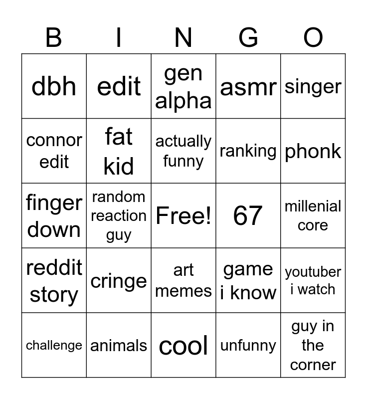 This bingo card has a free space and 24 words: cringe, animals, actually funny, challenge, singer, dbh, connor edit, edit, 67, art memes, ranking, finger down, game i know, youtuber i watch, fat kid, unfunny, millenial core, gen alpha, phonk, random reaction guy, guy in the corner, reddit story, asmr and cool.